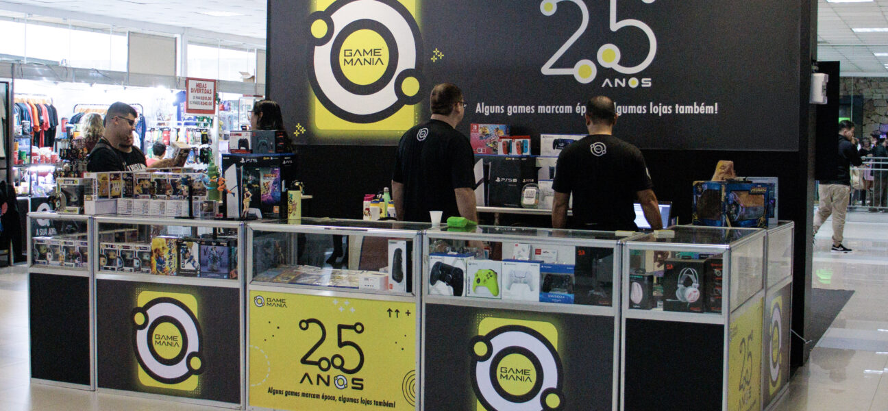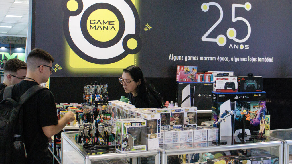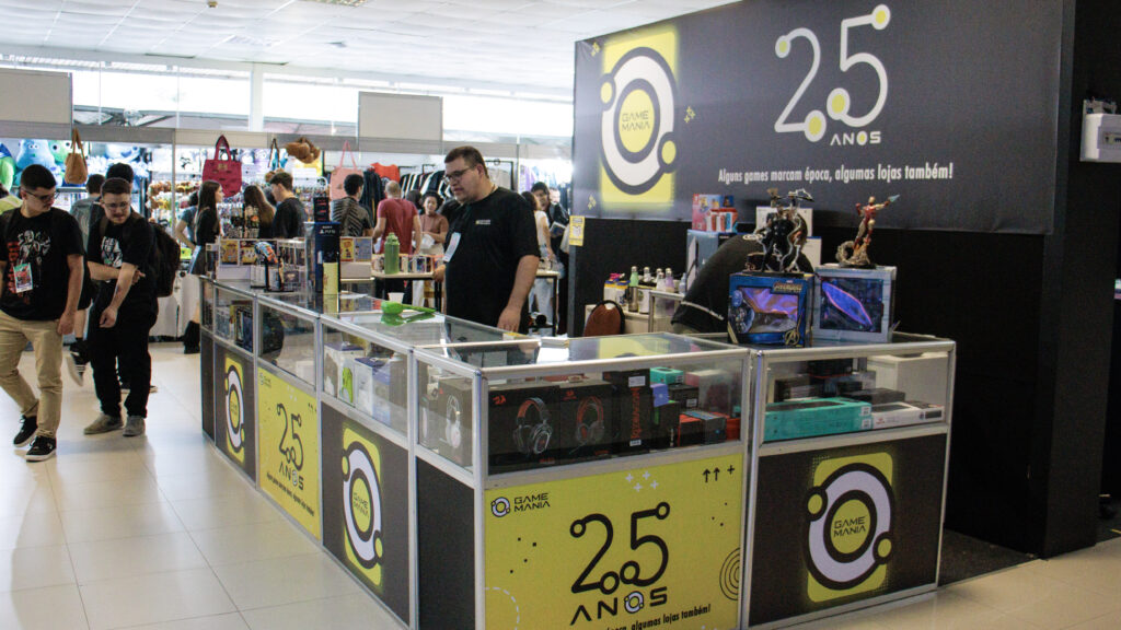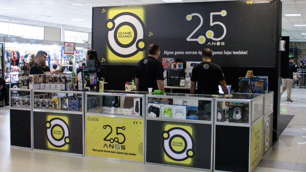 Logo ao lado da loja oficial do evento, nosso stand chamou atenção de quem passava: um espaço especialmente montado para celebrar os 25 anos da Game Mania, com identidade visual exclusiva, produtos selecionados e uma equipe pronta para receber os apaixonados por videogame. Foi ali que, com muito orgulho, apresentamos pela primeira vez nossos materiais comemorativos de 25 anos, relembrando a trajetória de quem começou como locadora e hoje é referência no mercado gamer de Santa Catarina.